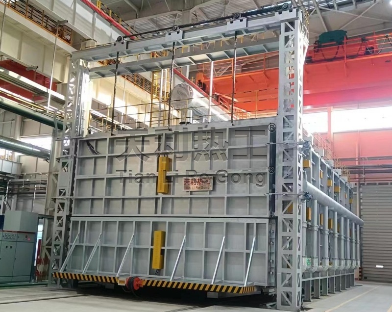 設備結構:本設備為臺車式熱處理爐,工件放置在內筐內部,通過由爐外工作臺驅動料架進入到爐罐內,爐罐放置在臺車上。臺車帶動爐罐進入到爐內進行熱處理。